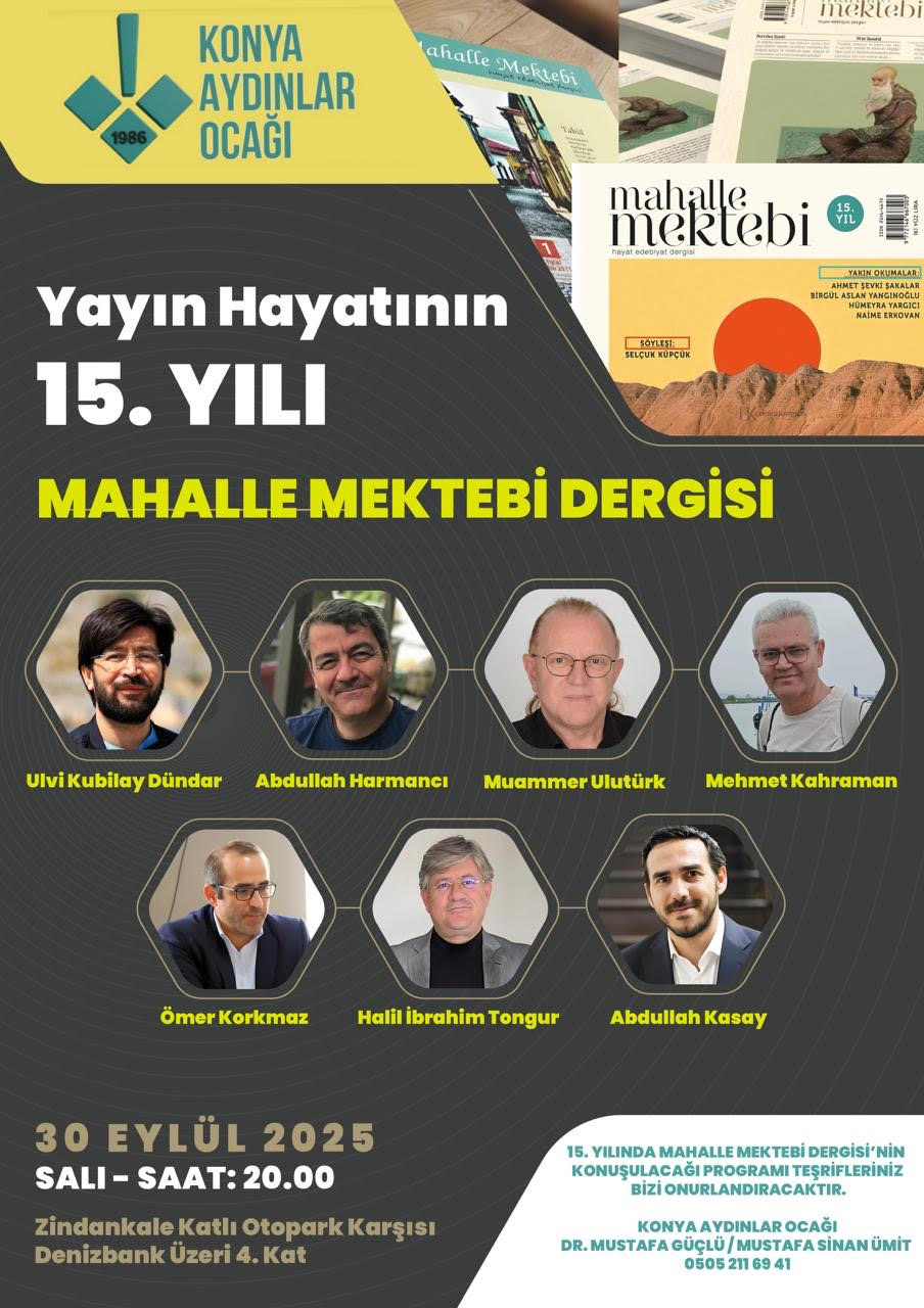 30/09/2025Konya'da 15 yıldır yayımlanan ve 85. sayısıyla okurlarının karşısına çıkan Mahalle Mektebi dergisi için Konya Aydınlar Ocağı bir program düzenledi.